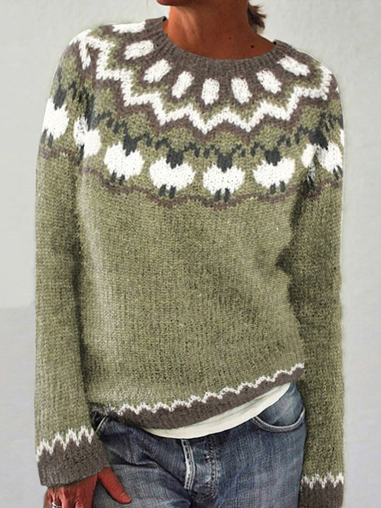 Vintage Animal Sheep Contrast Jacquard Crew Neck Sweater