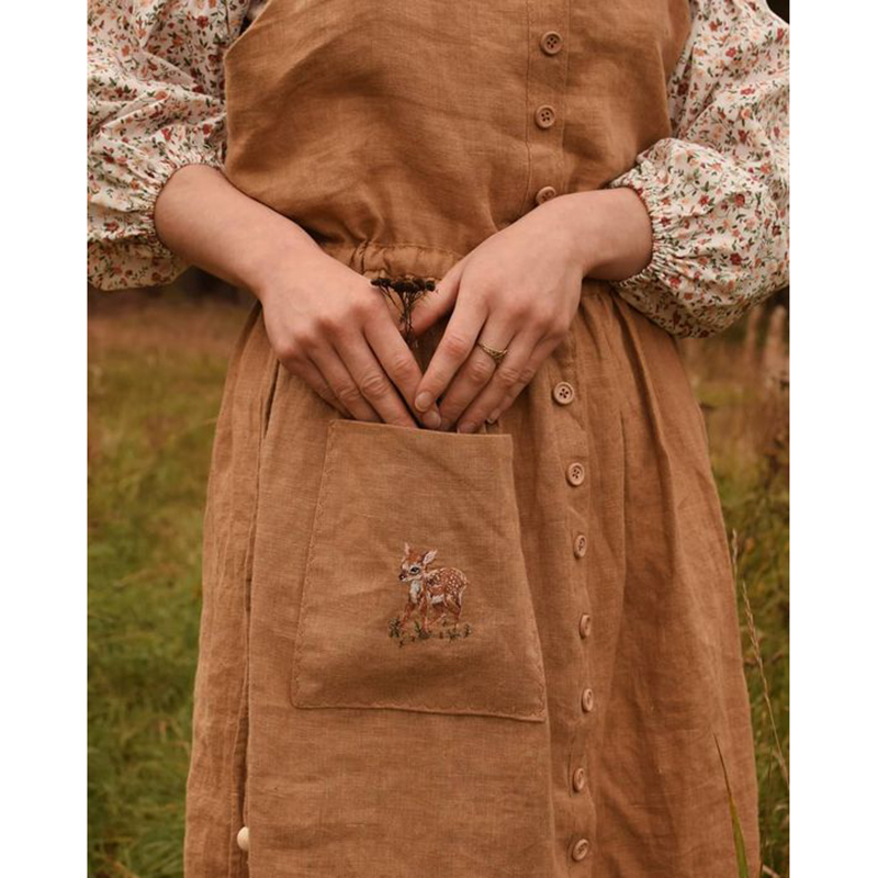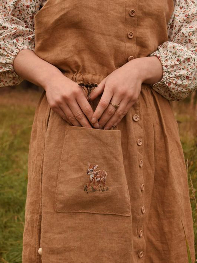 Vintage Deer Embroidery Cotton Linen Midi Dress