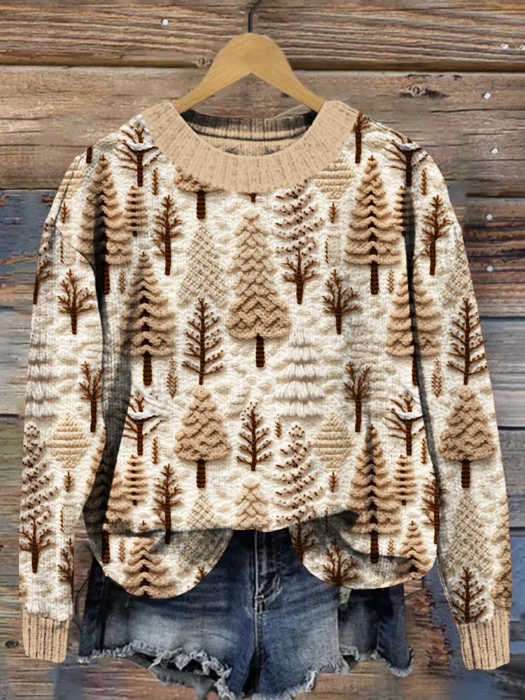 Beige Forest Embroidery Art Vintage Comfy Sweater