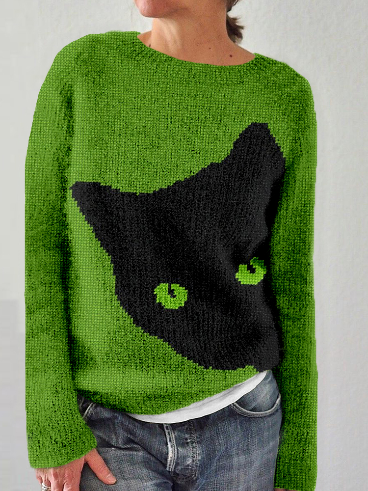 • Black Cat Knit Art Crew Neck Cozy Sweater