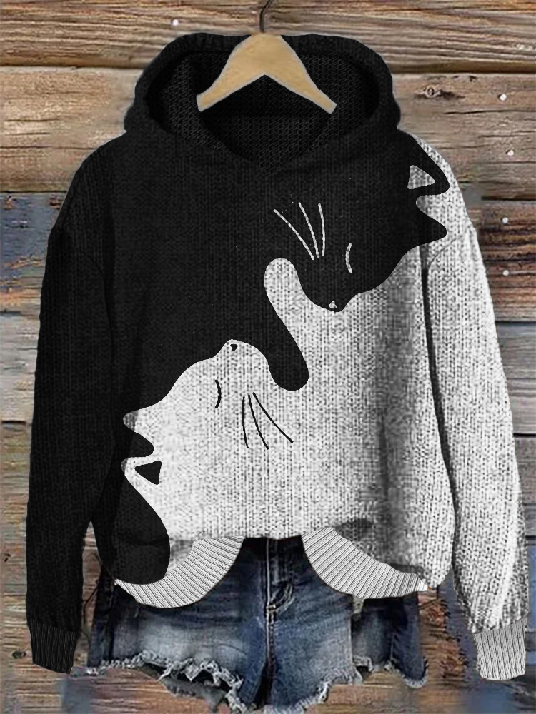 • Black & White Cats Contrast Color Cozy Knit Hoodie