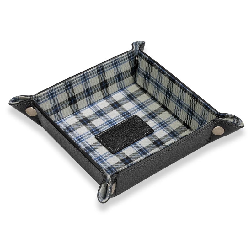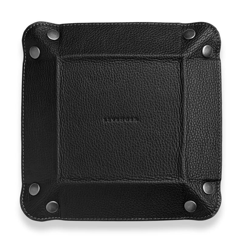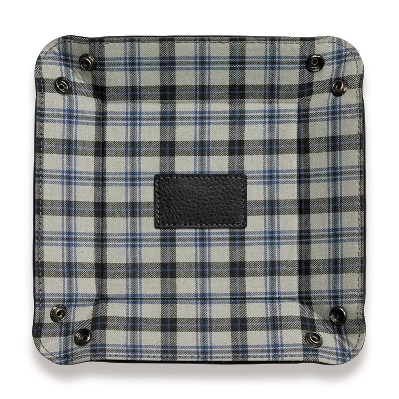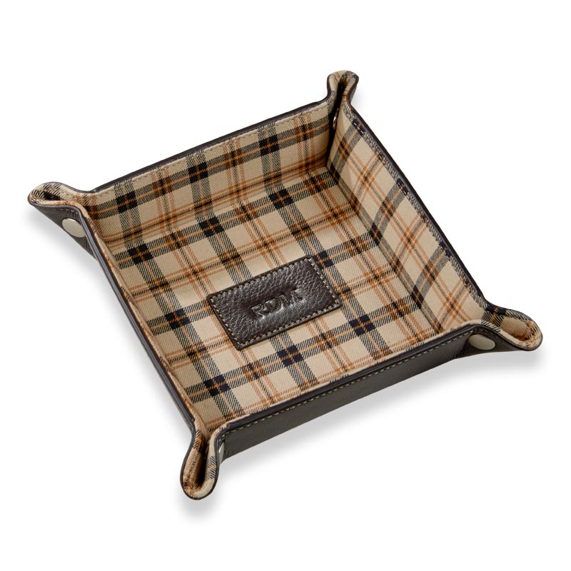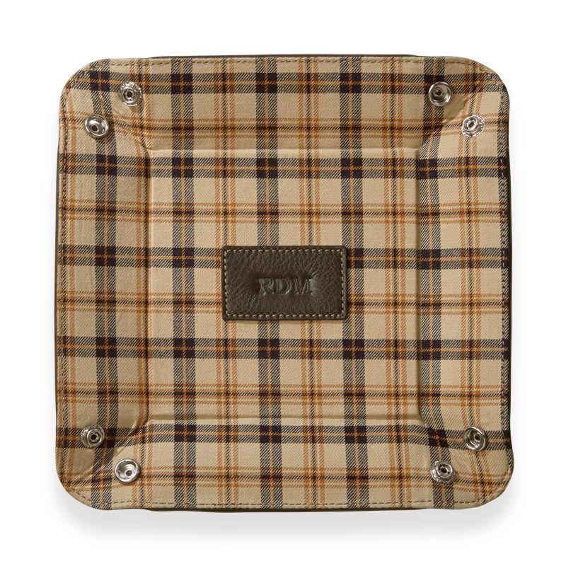 A foldable leather desk tray for travelers. Here’s a valet tray that folds and snaps to keep you organized wherever you go. The Bomber Jacket Snap Tray holds small accessories for your desk or wherever you choose. It lays flat for easy storage or travel when you unfasten the snaps. Add a monogram for a personal touch.