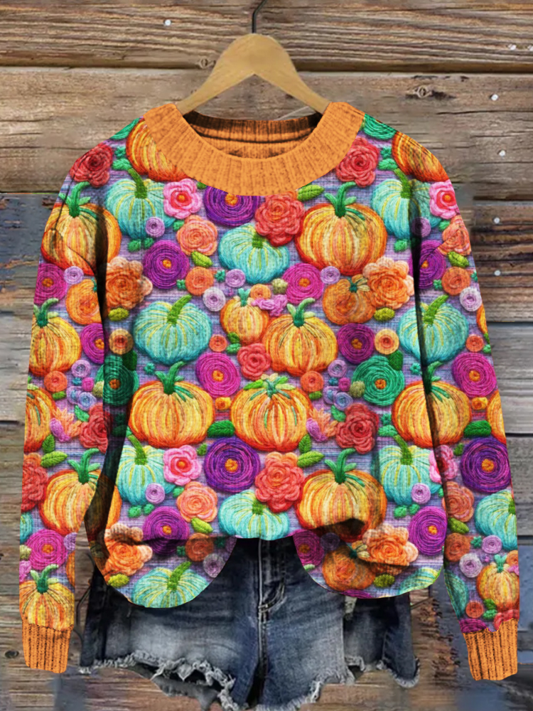 • Bright Rainbow Pumpkins Embroidery Art Comfy Sweater