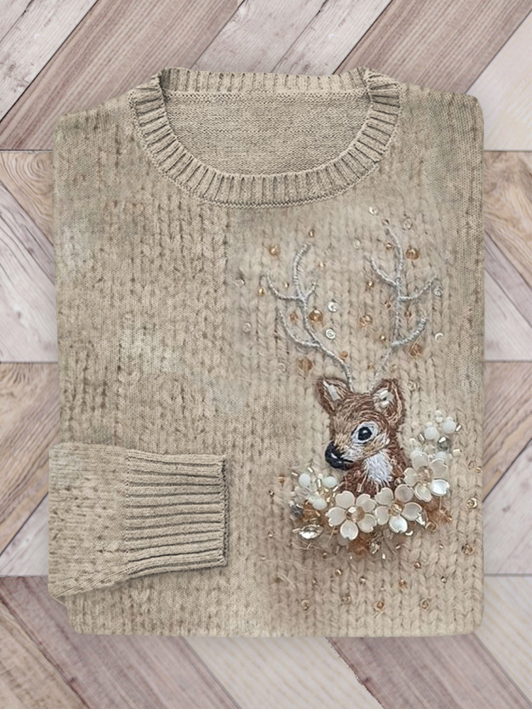 • Christmas Reindeer Floral Beaded Embroidery Art Knit Sweater