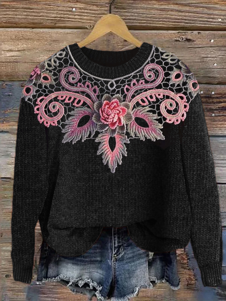 • Classy Floral Crochet Art Cozy Knit Sweater
