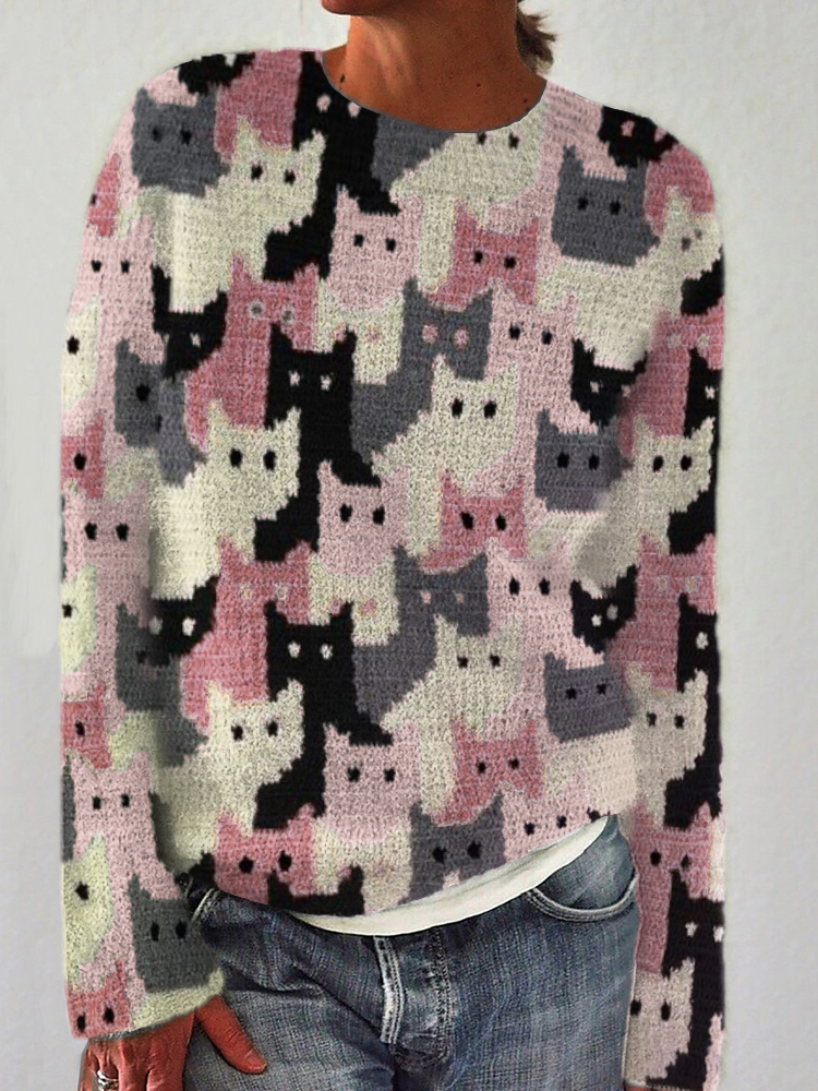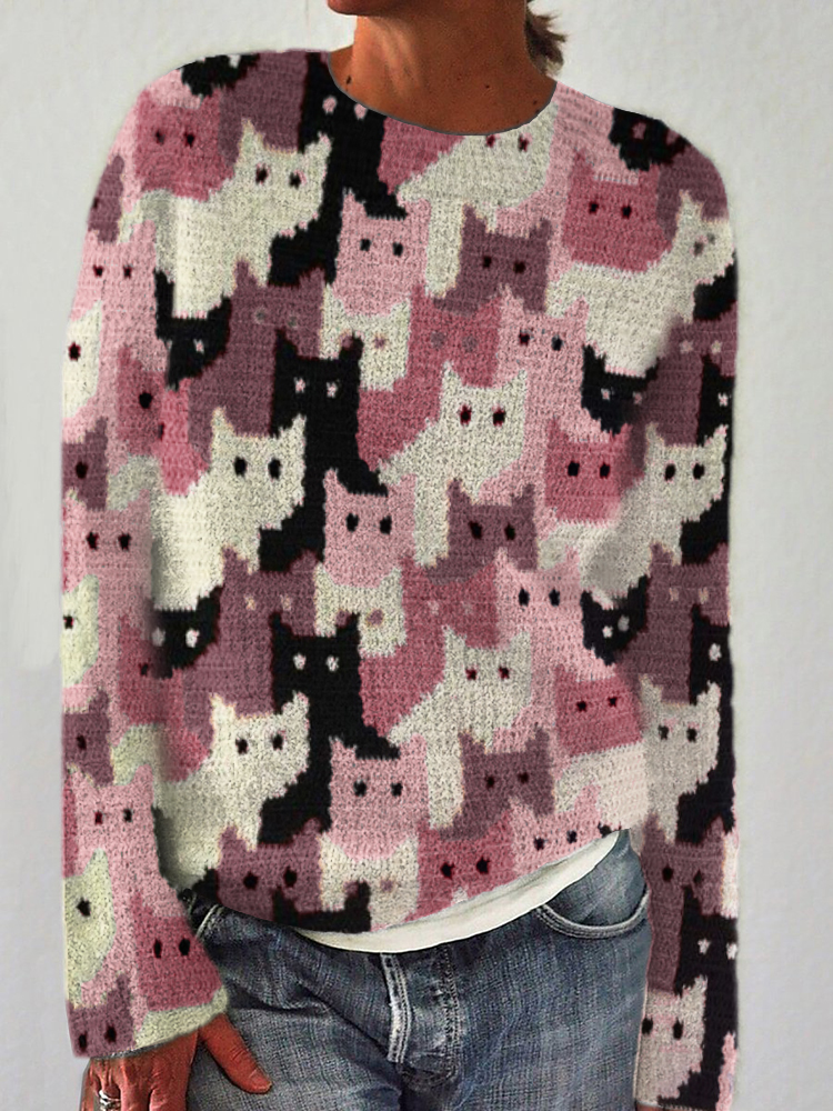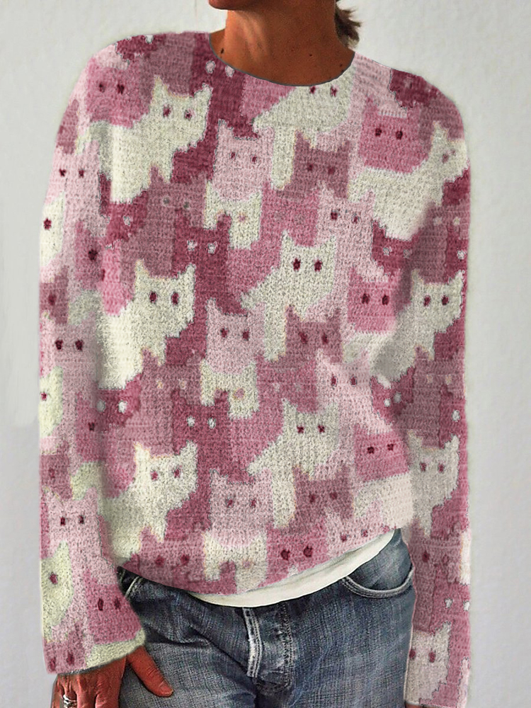 • Crowded Cats Pink Knit Art Cozy Sweater