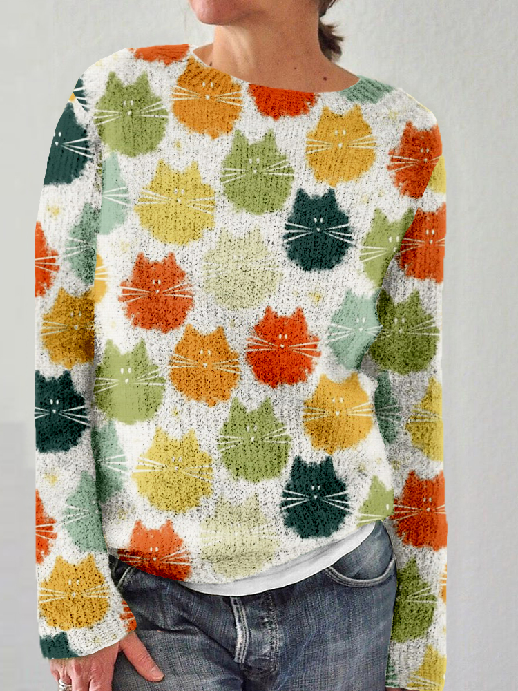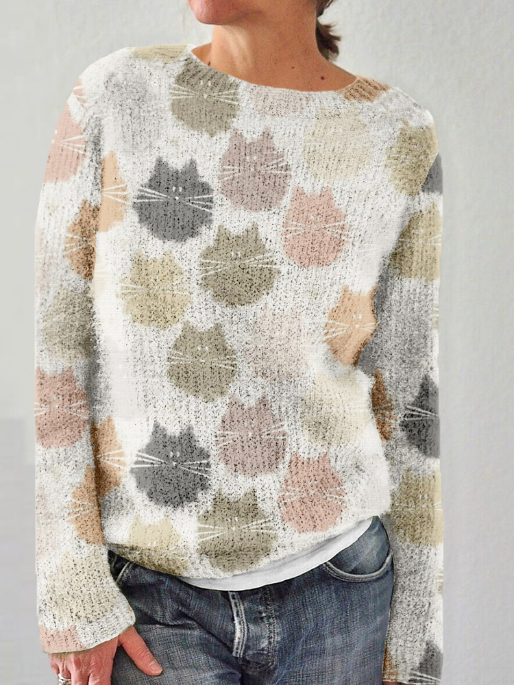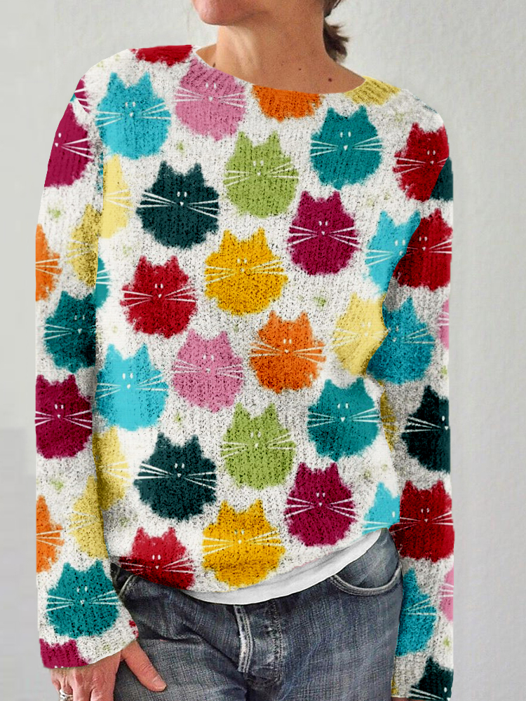 • Cute Fluffy Cats Pattern Crew Neck Cozy Sweater