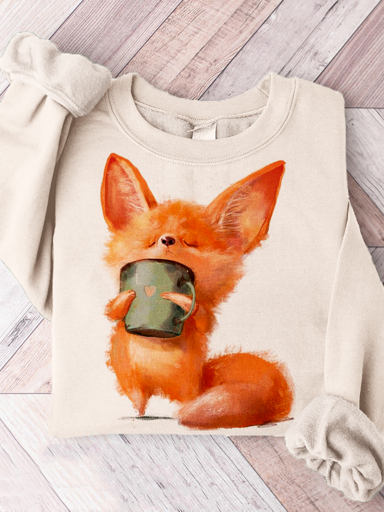 • Cute Fox Pattern Print Crew Neck Comfy Sweatshirt