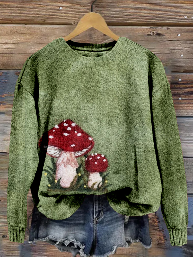 Cute Mushroom Felt Art Vintage Cozy Knit Sweater