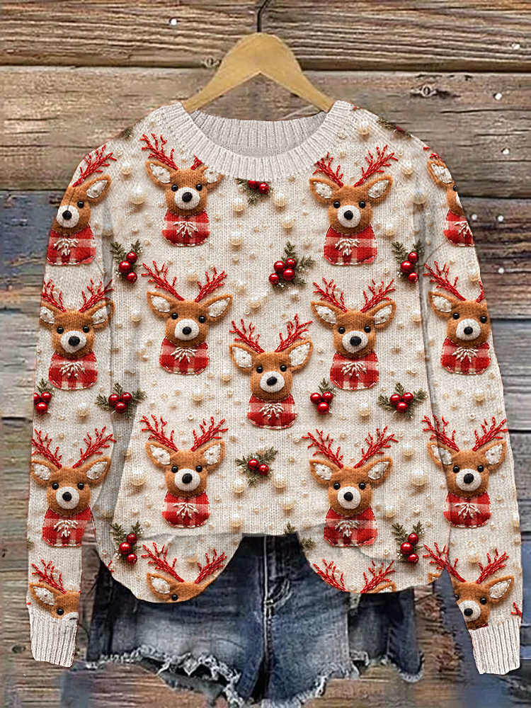 • Cute Retro Reindeer Christmas Casual Cozy Knit Sweater