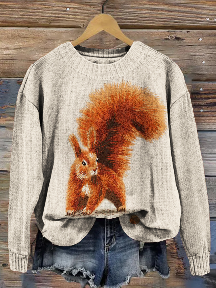 • Cute Squirrel Embroidery Art Vintage Cozy Sweater