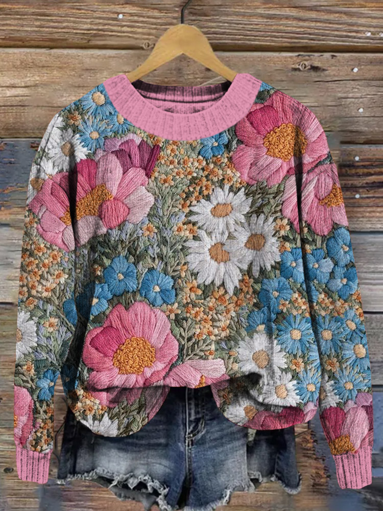 Embroidered Flowers Art Crew Neck Cozy Knit Sweater