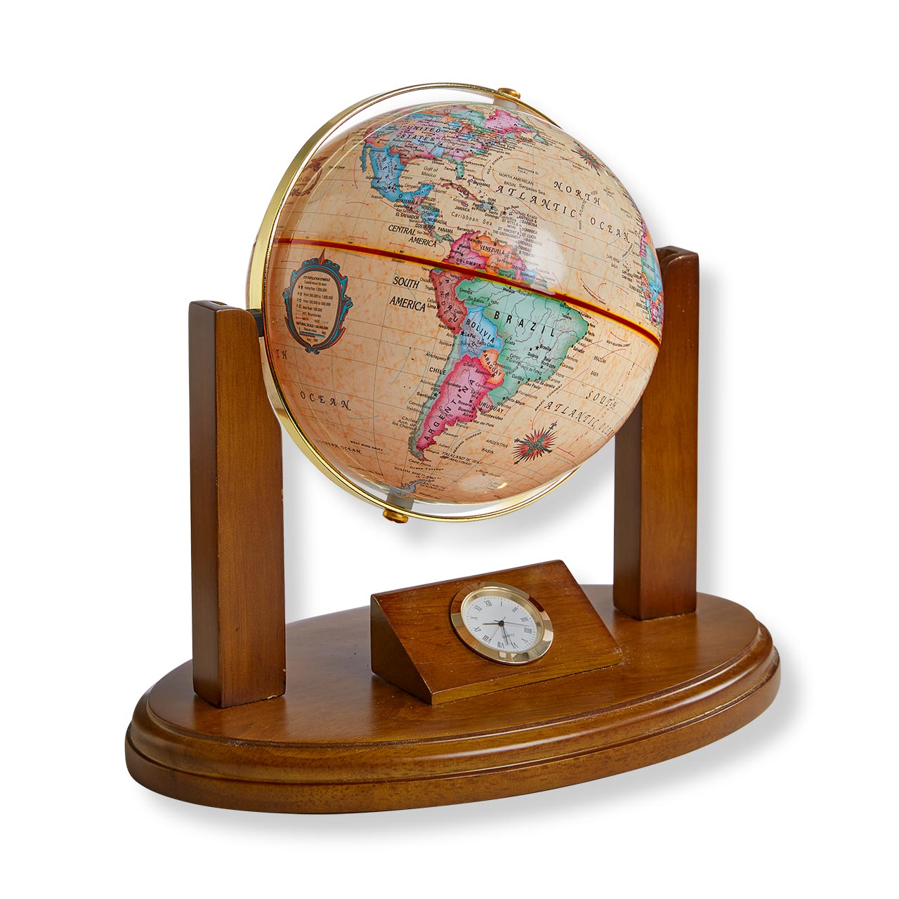 From the world-renowned Replogle globe makers of Chicago comes this unique table and desk clock that keeps the world at your fingertips. Featuring up-to-date cartography from January 2023, the handmade mini globe (made in the USA) is mounted on a solid hardwood base above the Gyro-Matic Meridian quartz clock.