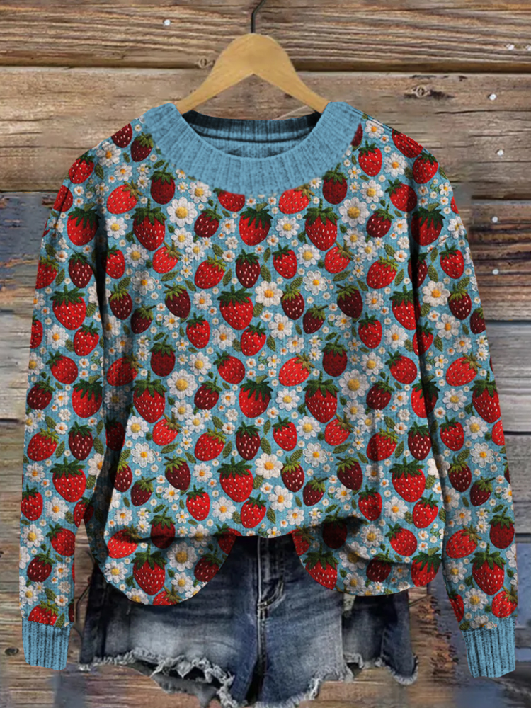 • Felt Strawberries and Flowers Embroidery Art Cozy Sweater