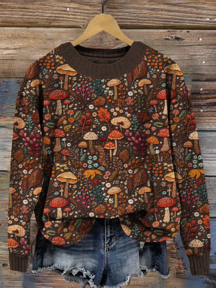 • Floral and Mushroom Embroidery Art Knit Sweater