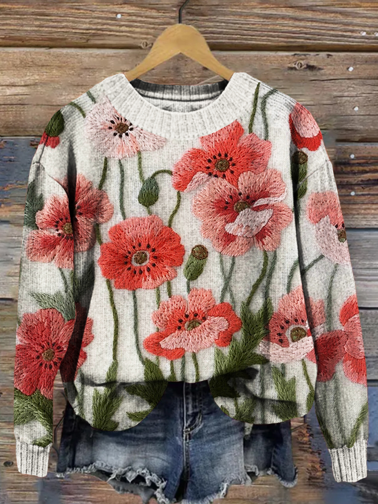 • Floral Embroidery Art Crew Neck Comfy Sweater
