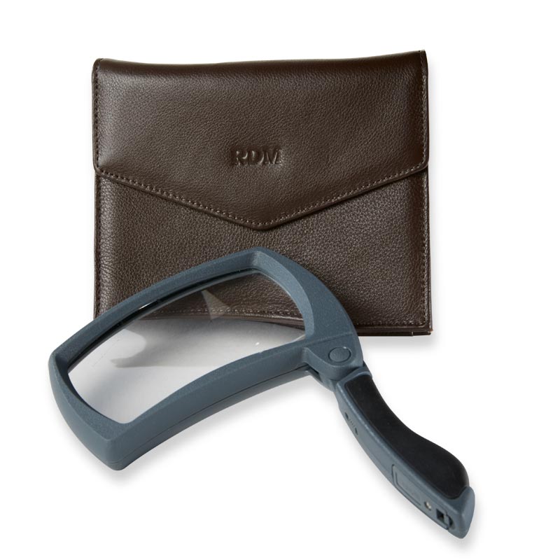 Read small print with ease. This folding magnifier features a rectangular lens, shaped for the way you naturally view things. The collapsible handle locks into any of three different positions for the most comfortable alignment. Fold the handle flush for easy storage. Luxurious leather case protects your magnifier, and microfiber suede lining keeps it scratch-free.