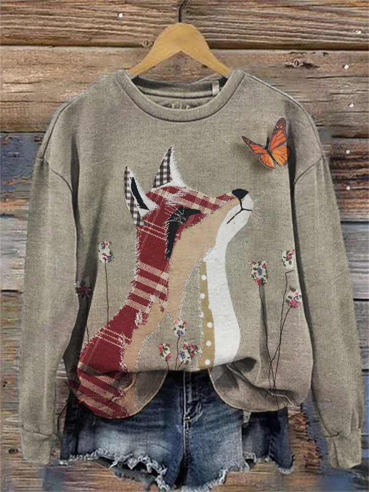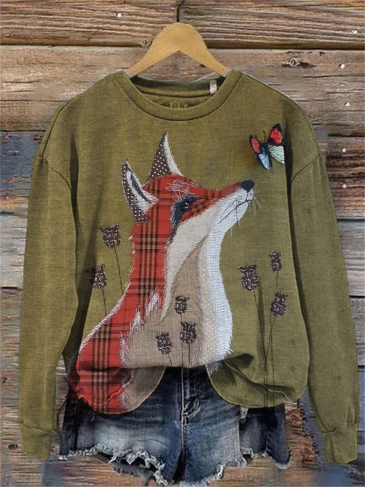 Forest Fox & Butterfly Fiber Art Cozy Sweatshirt