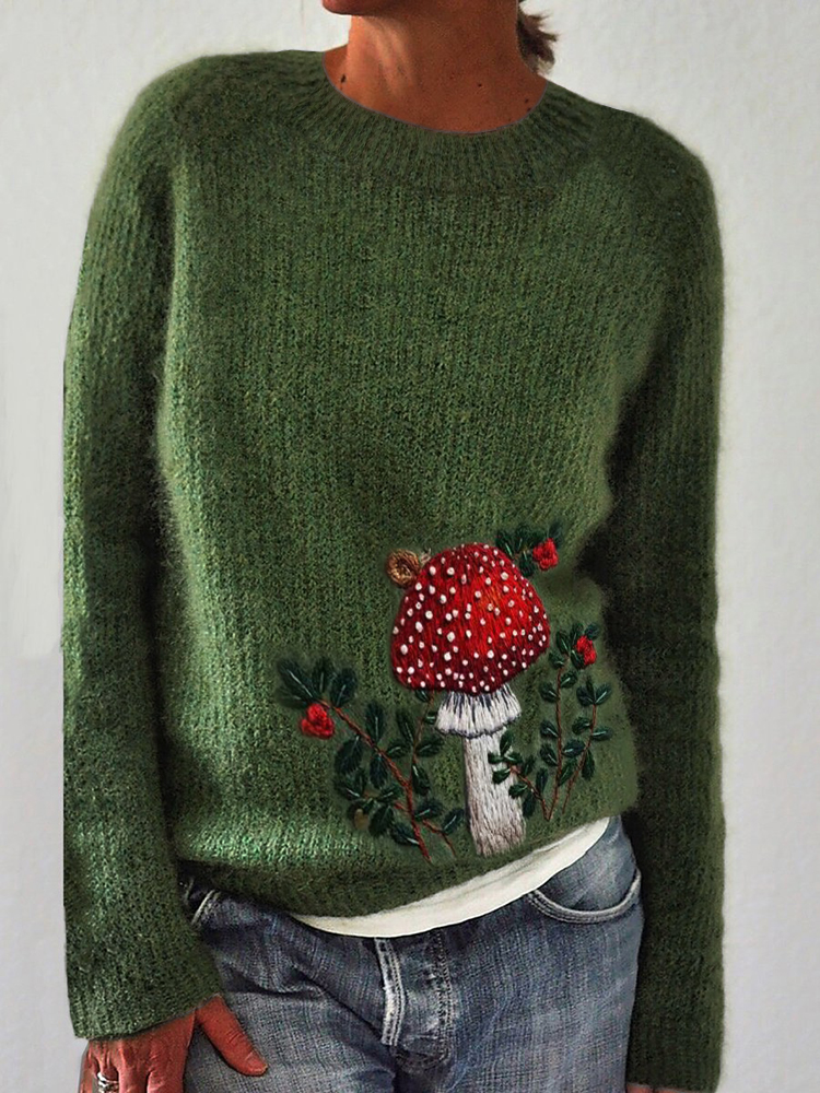 • Forest Fresh Mushroom Embroidery Art Cozy Knit Sweater