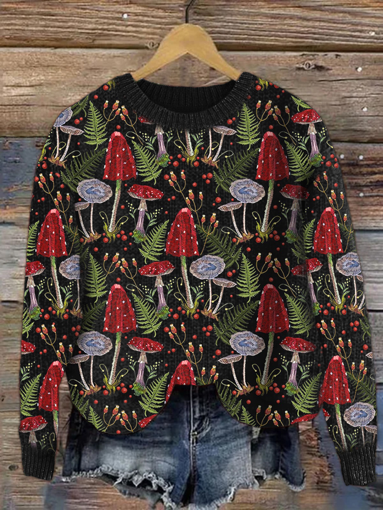 Forest Mushroom Floral Embroidery Art Cozy Knit Sweater