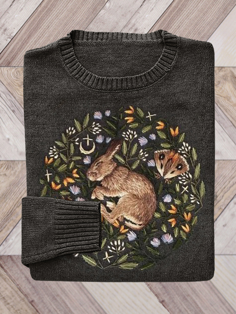 • Forest Sleeping Hare Embroidery Art Knit Sweater
