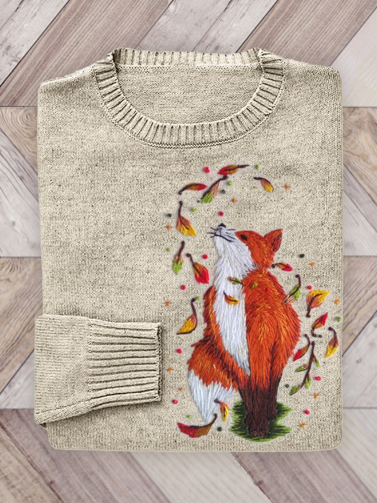 Fox & Falling Leaves Embroidery Art Cozy Knit Sweater