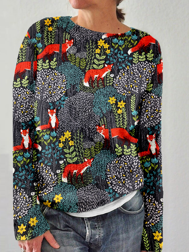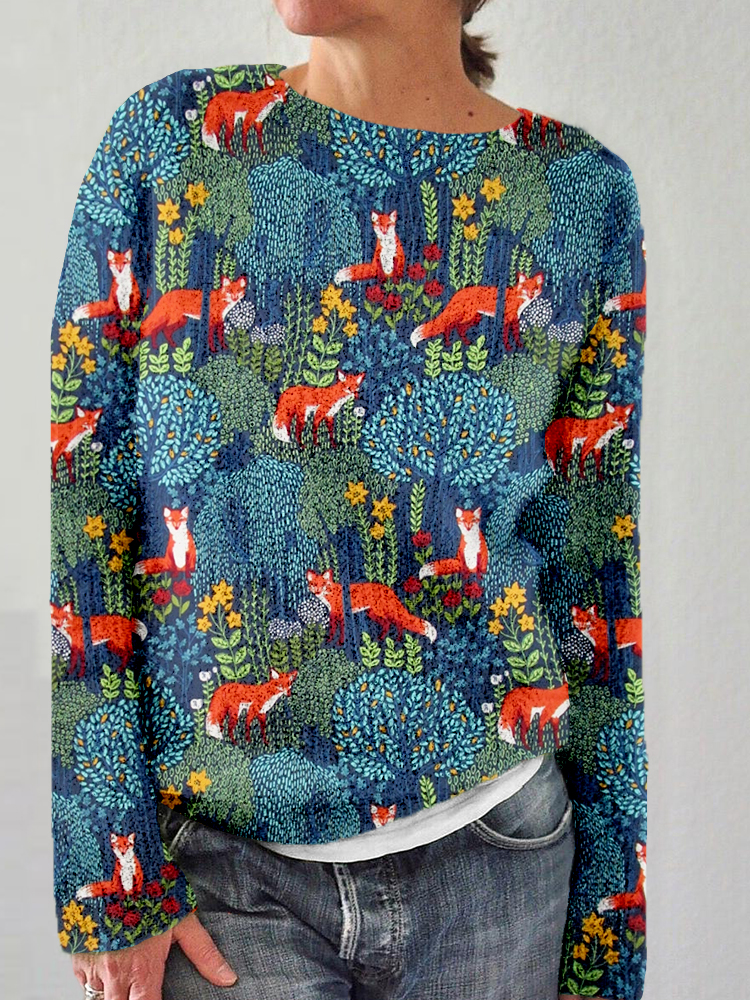 • Fox in the Forest Graphic Crew Neck Cozy Sweater