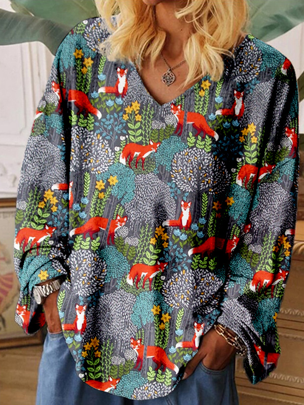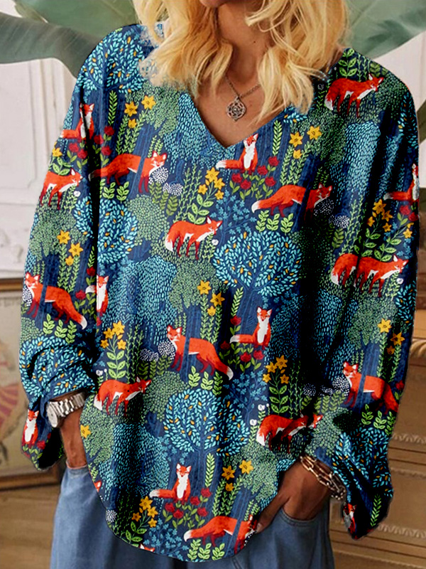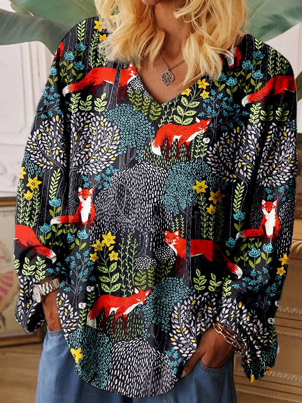 • Fox in the Forest Graphic V Neck Comfy T Shirt