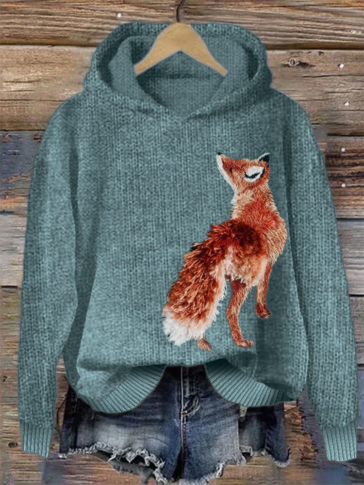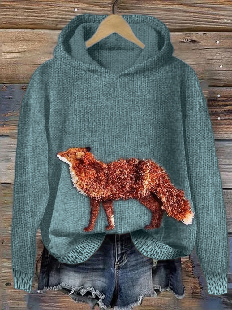 • Fuzzy Fox Embroidery Art Cozy Knit Hoodie