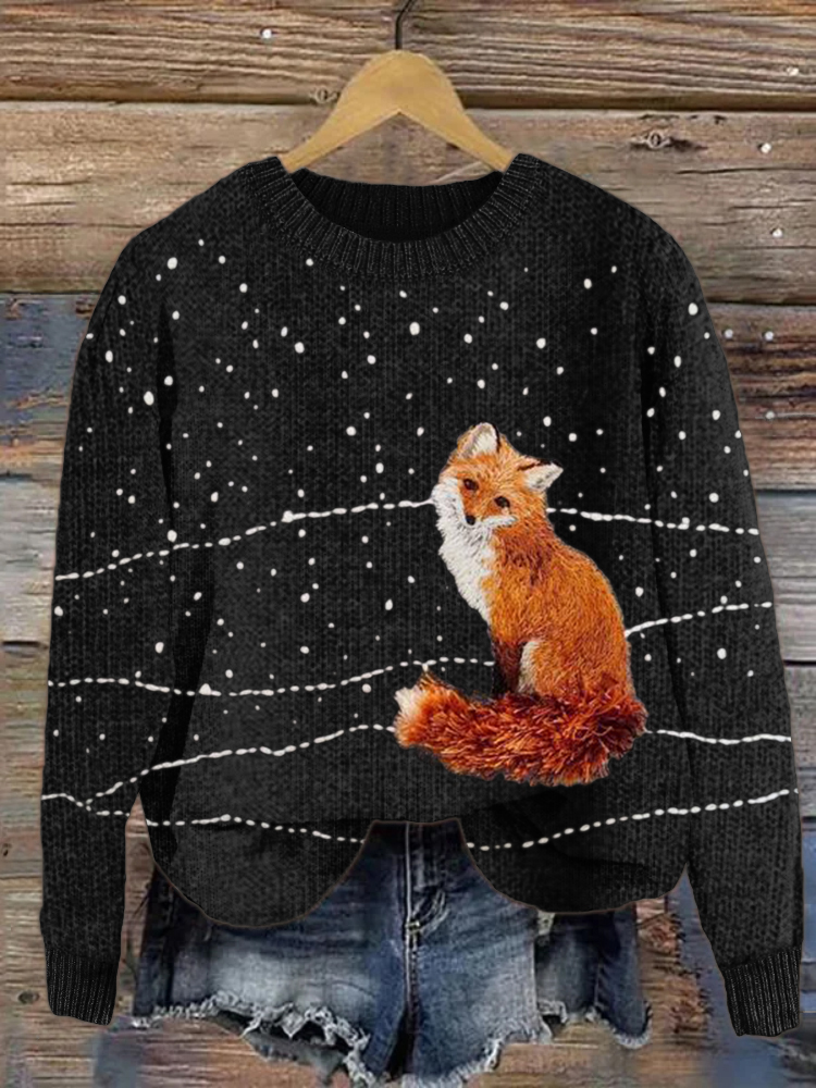 • Fuzzy Fox in the Snow Embroidery Cozy Knit Sweater