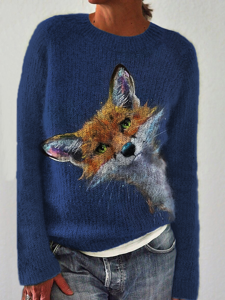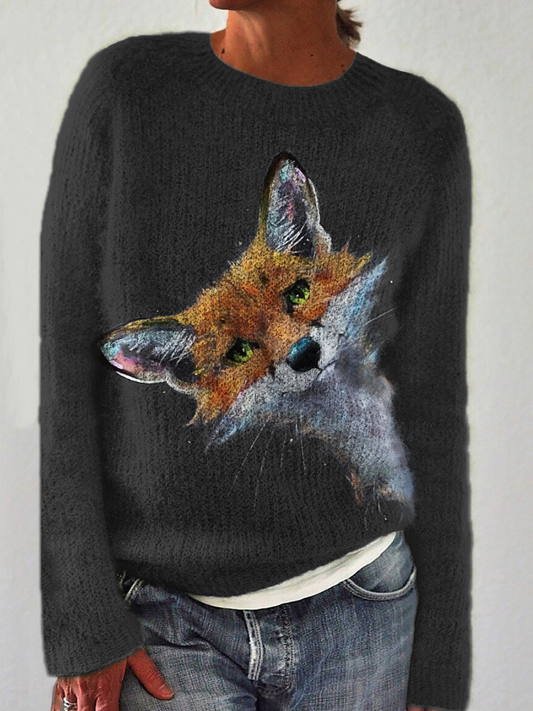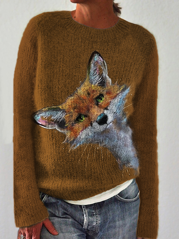 • Fuzzy Peeking Fox Painting Cozy Knit Sweater