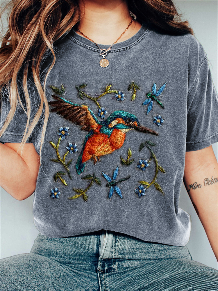 • Hummingbird & Dragonflies Floral Embroidery Vintage T Shirt