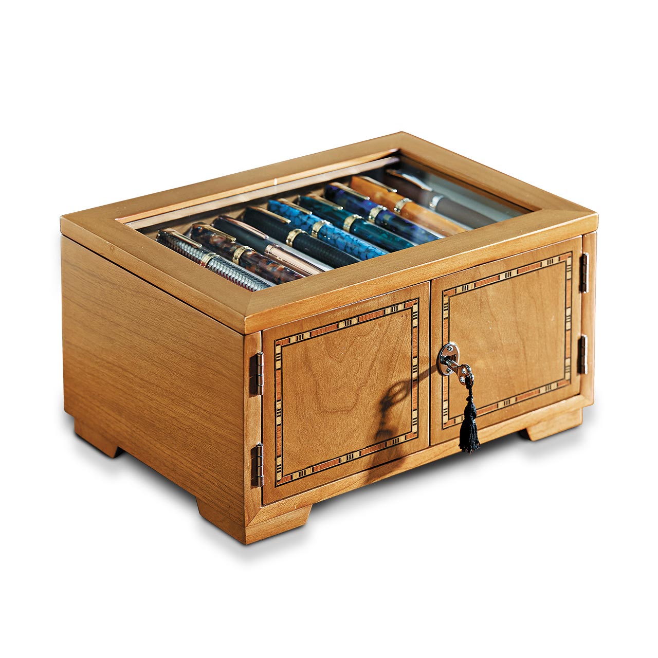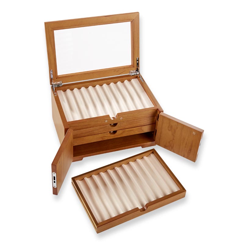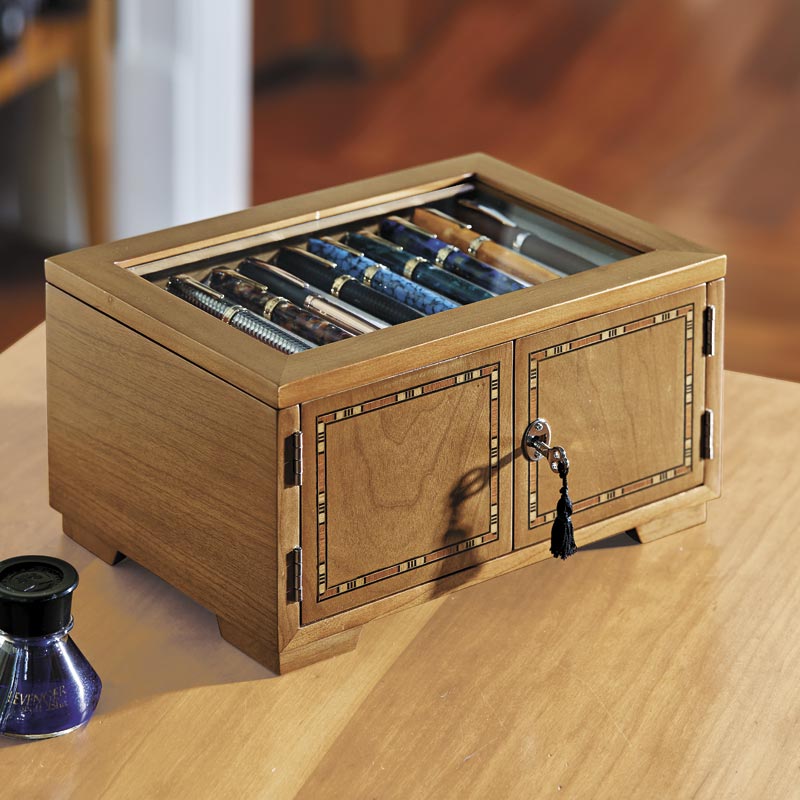 A dramatic pen case for collectors that holds 40 pens. Part of the pleasure of being a pen lover is visual; a certain satisfaction ensues from being able to admire your favorites (and have others do the same). Our Lock and Key Pen Case offers more than an attractive space for displaying your prize pens—it also keeps your collection protected and free from dust. Unlock the wood inlay doors and lift the hinged protective glass lid to reveal the 4 drawers, each with 10 felt-lined pen grooves.