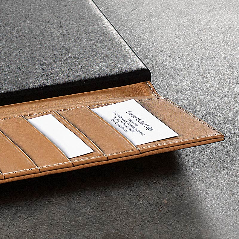 Create a great deskscape, starting with this full-grain leather desk mat. The Morgan leather desk blotter helps keep your workspace beautifully organized. The fold-up wings on either side offer card storage underneath: the left side can hold 15 business cards, and the right side 10 3 x 5 index cards. The smooth writing surface can be used with or without a desk pad or blotter, and the felt bottom protects your desk.
