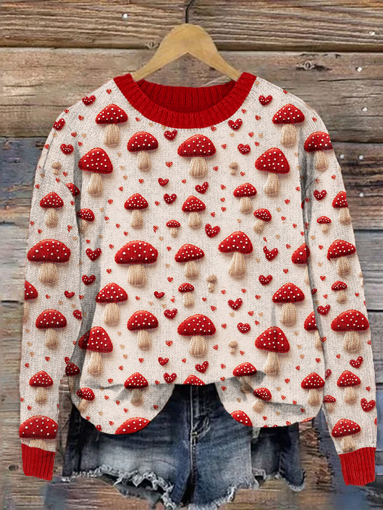 Mushrooms & Hearts Embroidery Art Casual Cozy Knitted Sweater