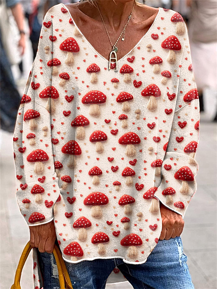 Mushrooms & Hearts Embroidery Art Casual Cozy V-Neck Long Sleeve T-Shirt