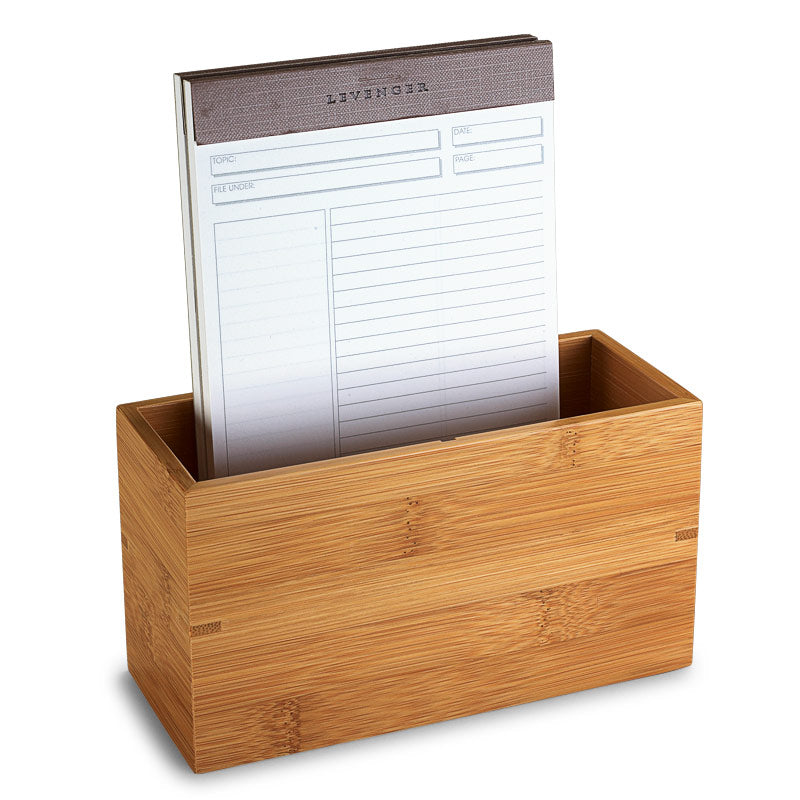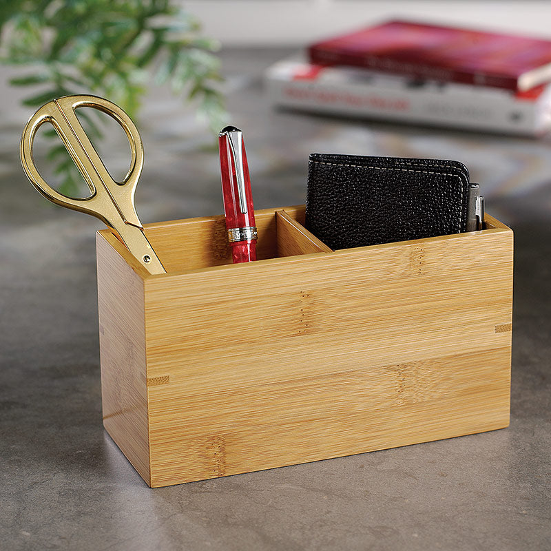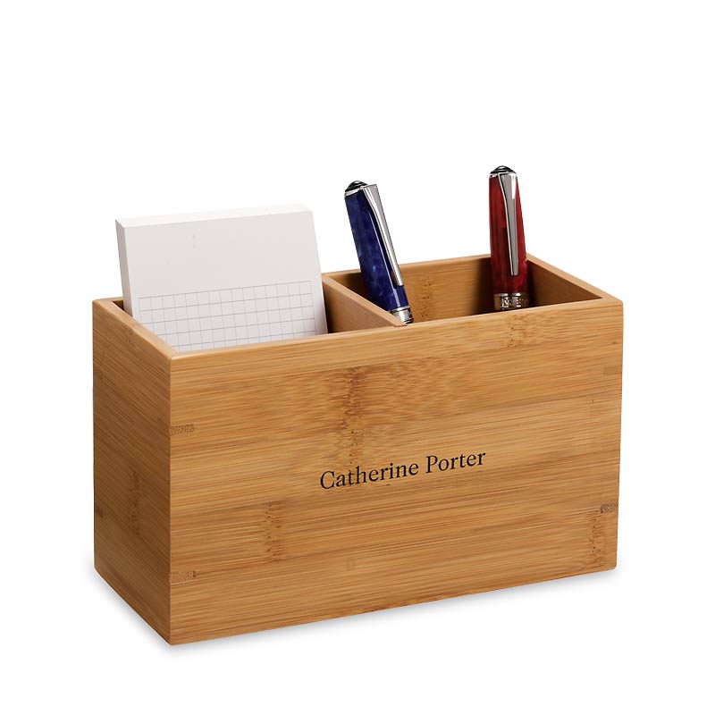 The horizontal note card box that transforms into a pen and tool holder. If you've ever seen how magic works, you know it's always done with a mere sleight of hand or simple illusory technique. Our Nantucket Note Card Box is a simple open horizontal box of solid bamboo, specially built for index cards, and it can transform into two vertical pen cups—just by adding a tiny partition in the middle.