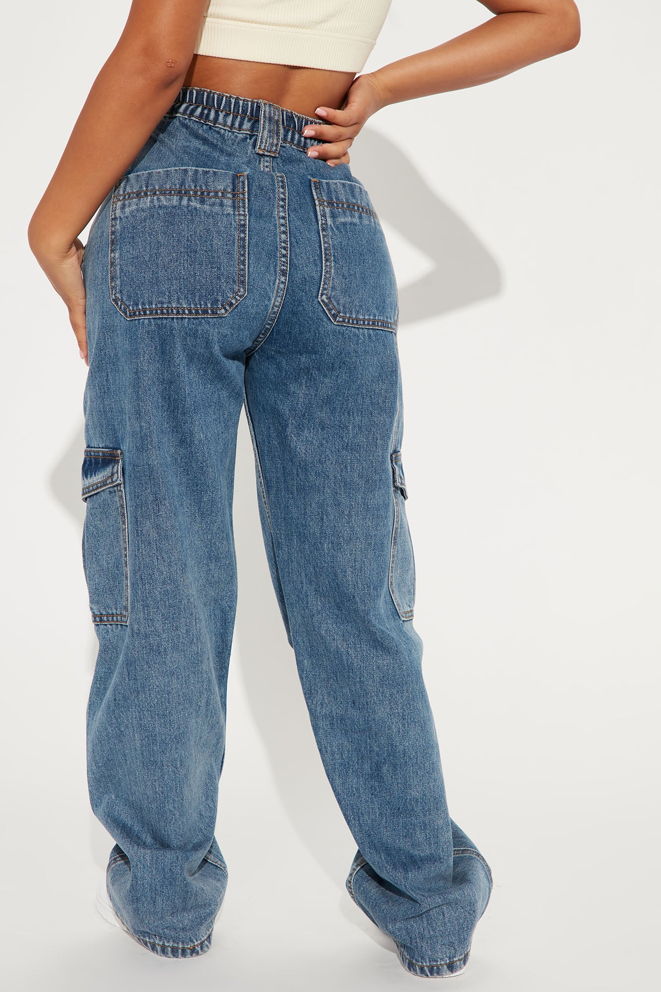 Petite Don't You Worry Wide Leg Cargo Jeans - Medium Blue Wash