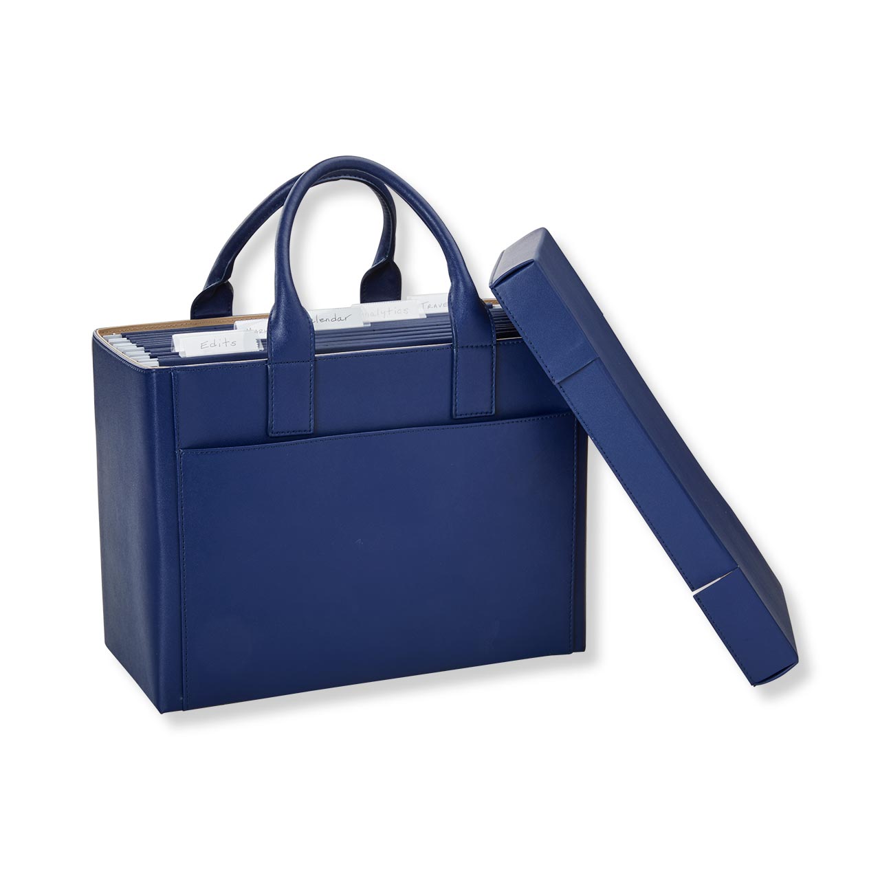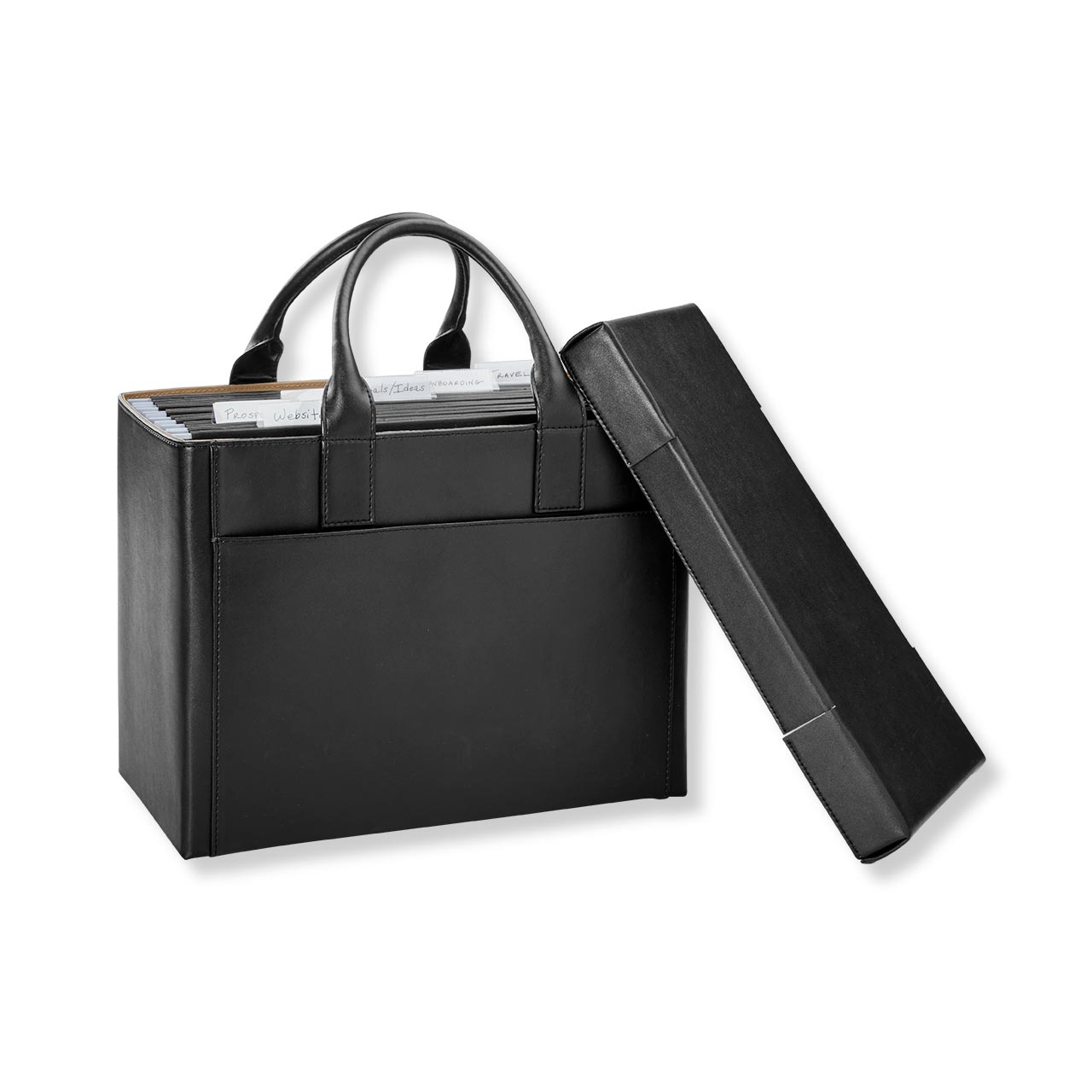 Organization on-the-go, including a set of six LevTex™ File Folders and a protective lid. Keep your paperwork and work files organized as you transport them from the office, home or wherever you go. This ensemble includes our Portable File Tote in our LevTex premium leather alternative and six matching hanging file folders, plus the lid. The folders hang neatly on the removable inside frame of the file tote.