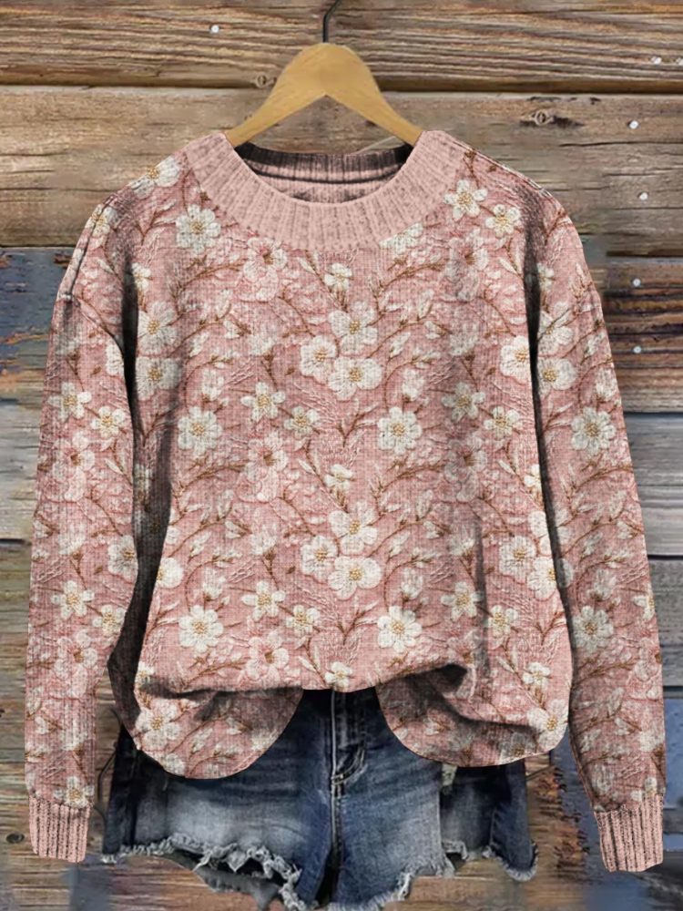 Pretty Pink and White Floral Faux Embroidery Art Cozy Sweater
