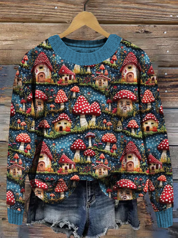 Red Mushroom House Fairy Garden Embroidery Art Cozy Sweater