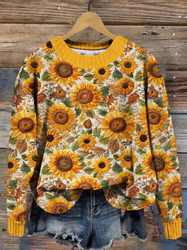 • Sunflower Floral Embroidery Art Cozy Knit Sweater