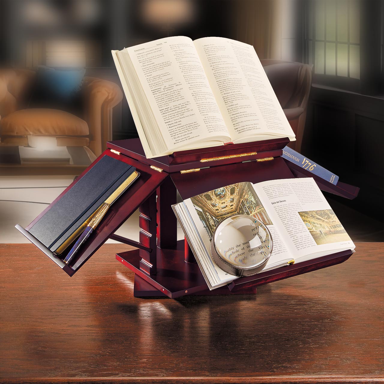 This Product Ships Free. A new world of reading unfolds. The Library-Go-Round adds a distinctive difference to your library, a unique way to show off your favorite tomes and a useful method of conducting research and taking notes. The five shelves of this revolving book display, inspired by one owned by Thomas Jefferson, can hold several books at various levels and angles and are also useful for note-taking and cross-checking information from several sources. The spinning lazy susan-style base of this rotating bookcase is perfect for spotlighting rare first editions, specialty books, favorite artwork and photographs. The Library-Go-Round folds up neatly into a 12" box when not in use.