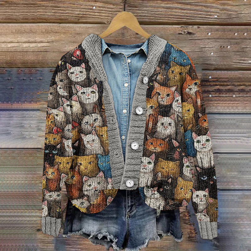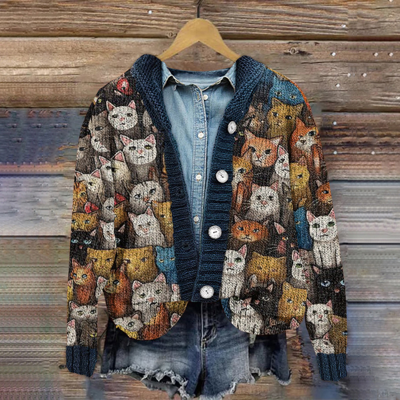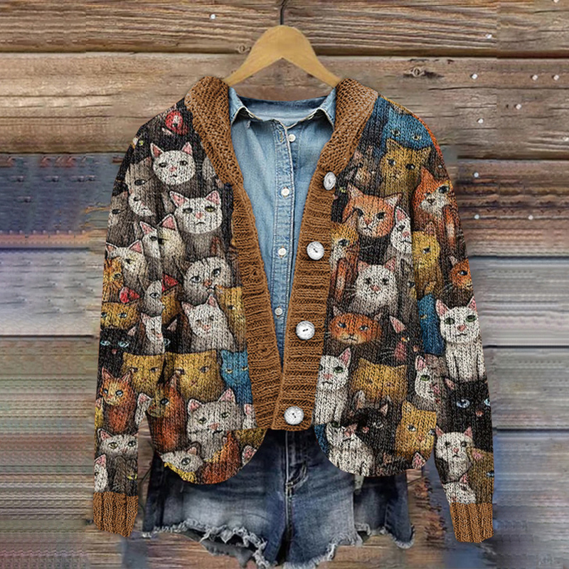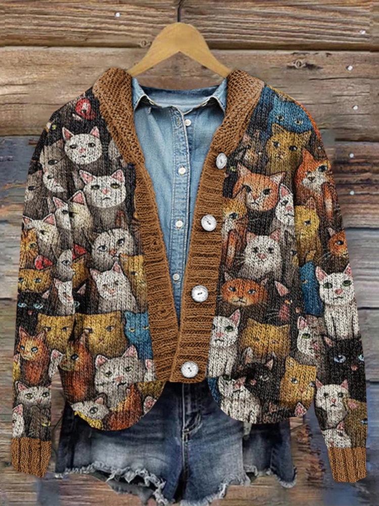 • Vintage Cat Print Button Hooded Knitted Cardigan