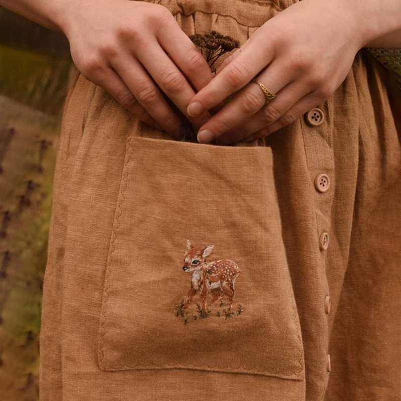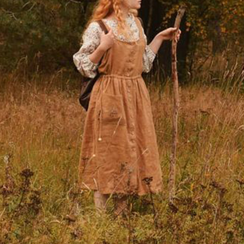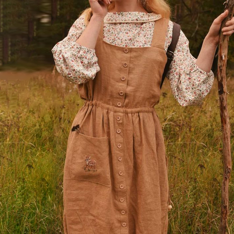 • Vintage Deer Embroidery Cotton Linen Midi Dress