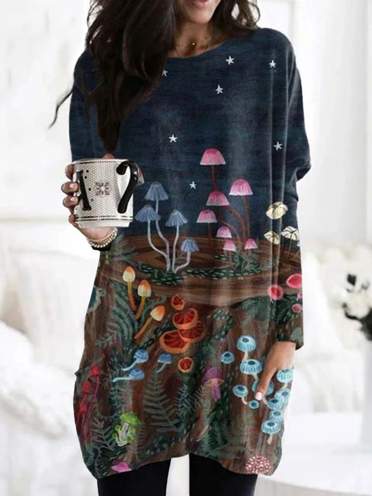 Vintage Forest Mushrooms Long Sleeve Casual Tunic