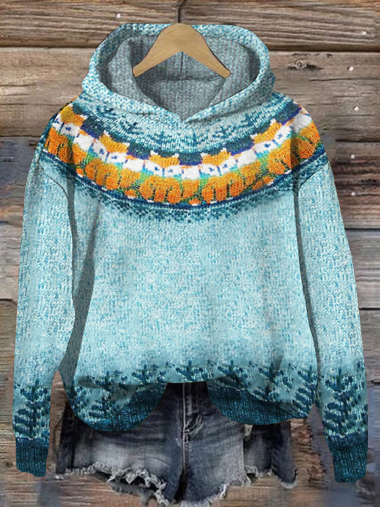 Vintage Fox Contrast Jacquard Hooded Sweater