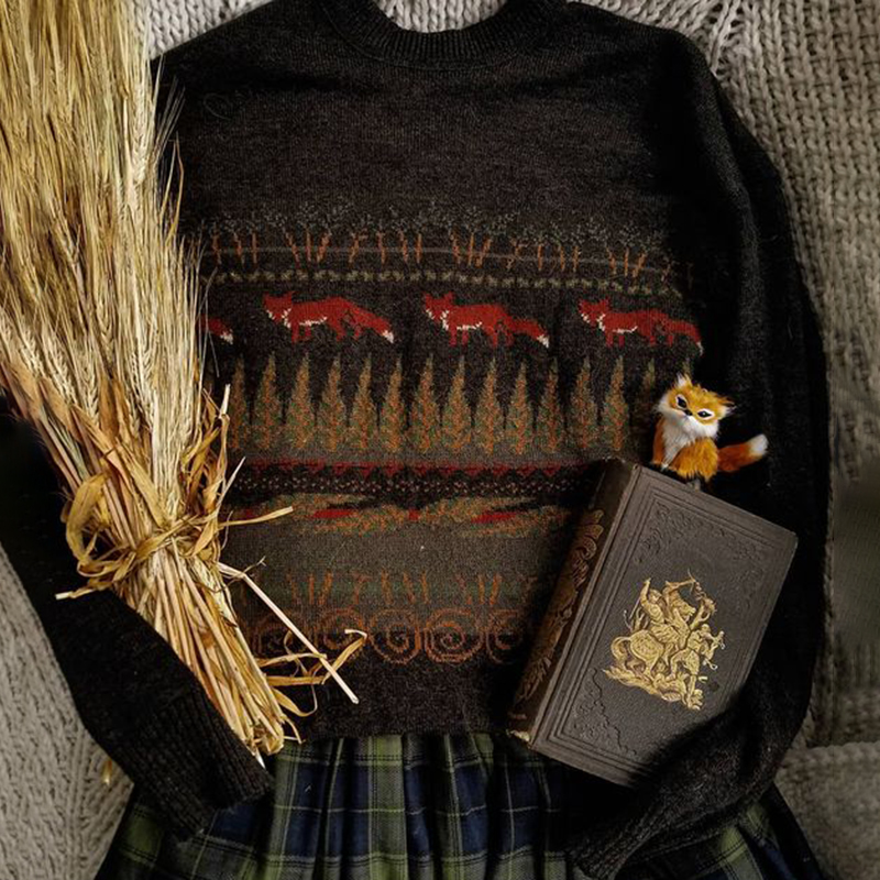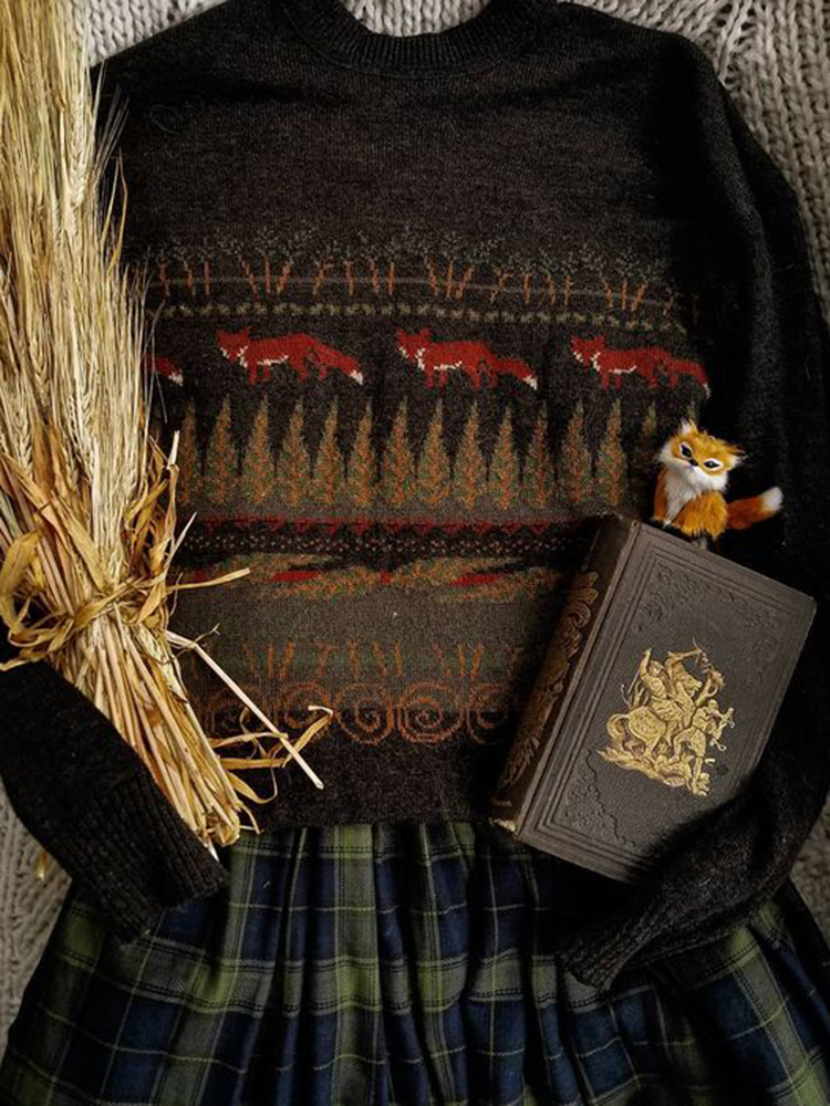 • Vintage Fox Pattern Warm Round Sleeve Comfy Sweater