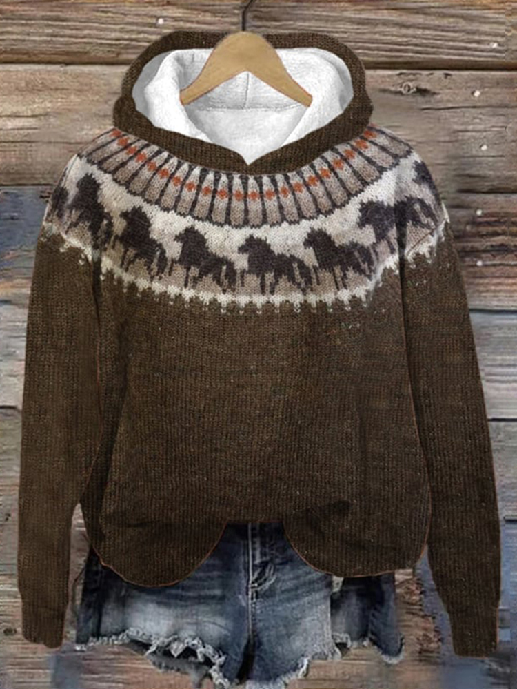 Vintage Western Ethnic Horse Print Long Sleeve Knitted Hooded Sweater