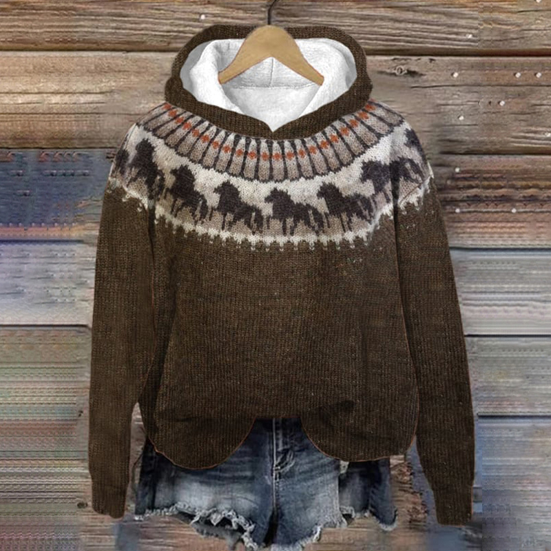 • Vintage Western Ethnic Horse Print Long Sleeve Knitted Hooded Sweater